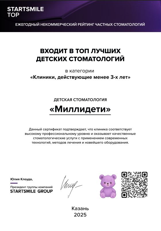 Для нас эта награда — ценный знак отличия. Благодарим каждого родителя за безграничное доверие, а каждого маленького пациента — за смелость и улыбки. Вы вдохновляете нас каждый день становиться лучше, внедрять новые методики и поддерживать высочайший уровень сервиса.