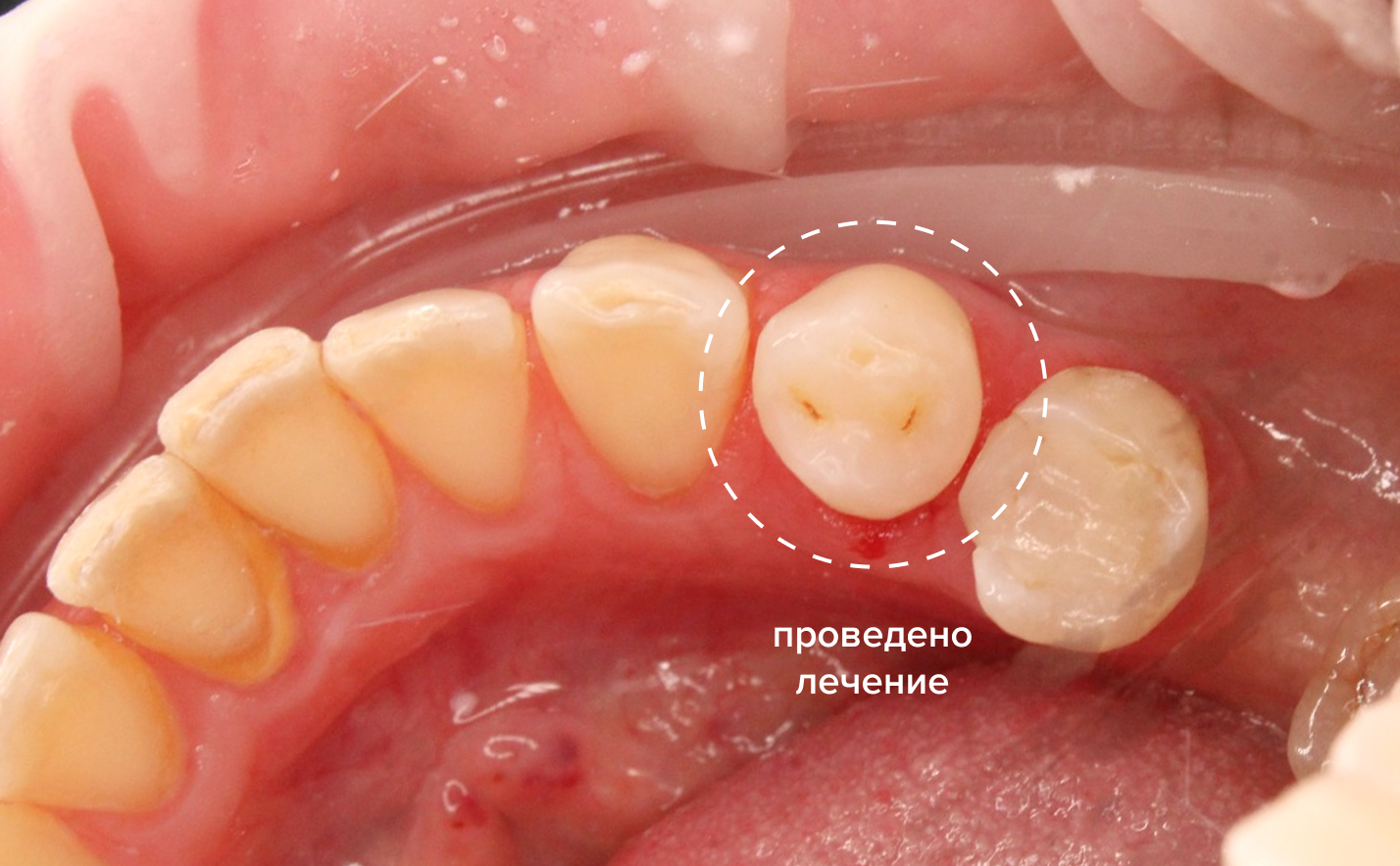 Проведеное лечение вторичного кариеса и восстановление поверхности зуба