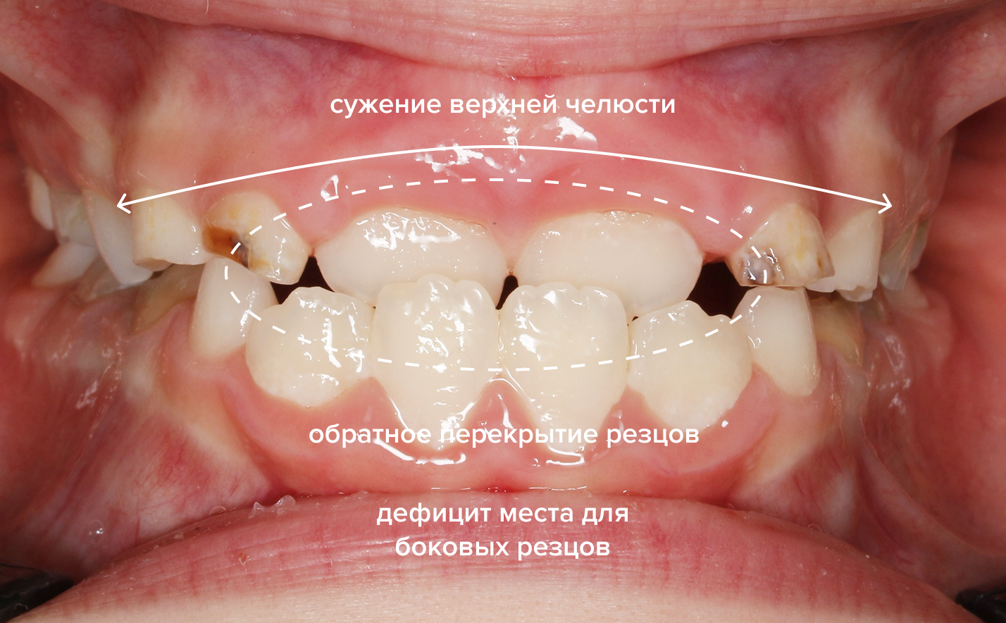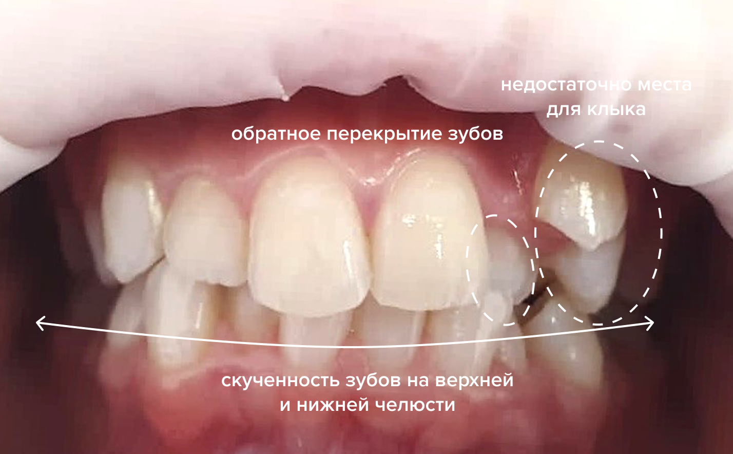 Ситуация: скученность зубов на верхней и нижней челюсти, обратное перекрытие в области зуба 2.2, полный дефицит места для левого верхнего клыка 2.3.