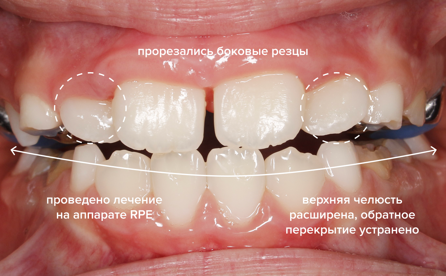 Проведено лечение на брекет-системе с использованием ортодонтических минивинтов. Исправлена скученность зубов, устранено обратное перекрытие, зуб 2.3 установлен в зубной ряд.