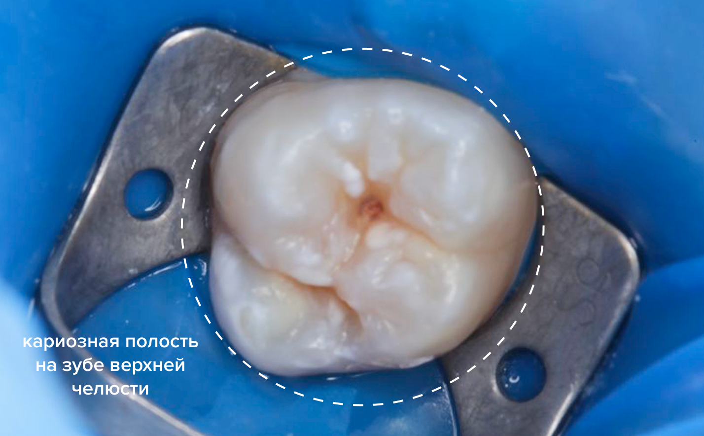 Пациент обратился с целью санации перед ортодонтическим лечением. На приеме обнаружили кариозную полость на зубе 1.6.