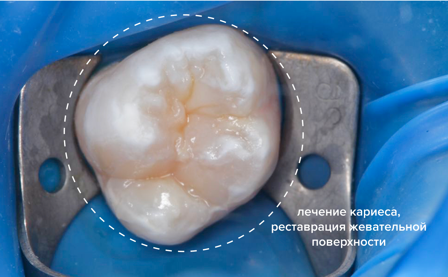 Проведено препарирование кариозной полости и реставрация пломбировочным материалом