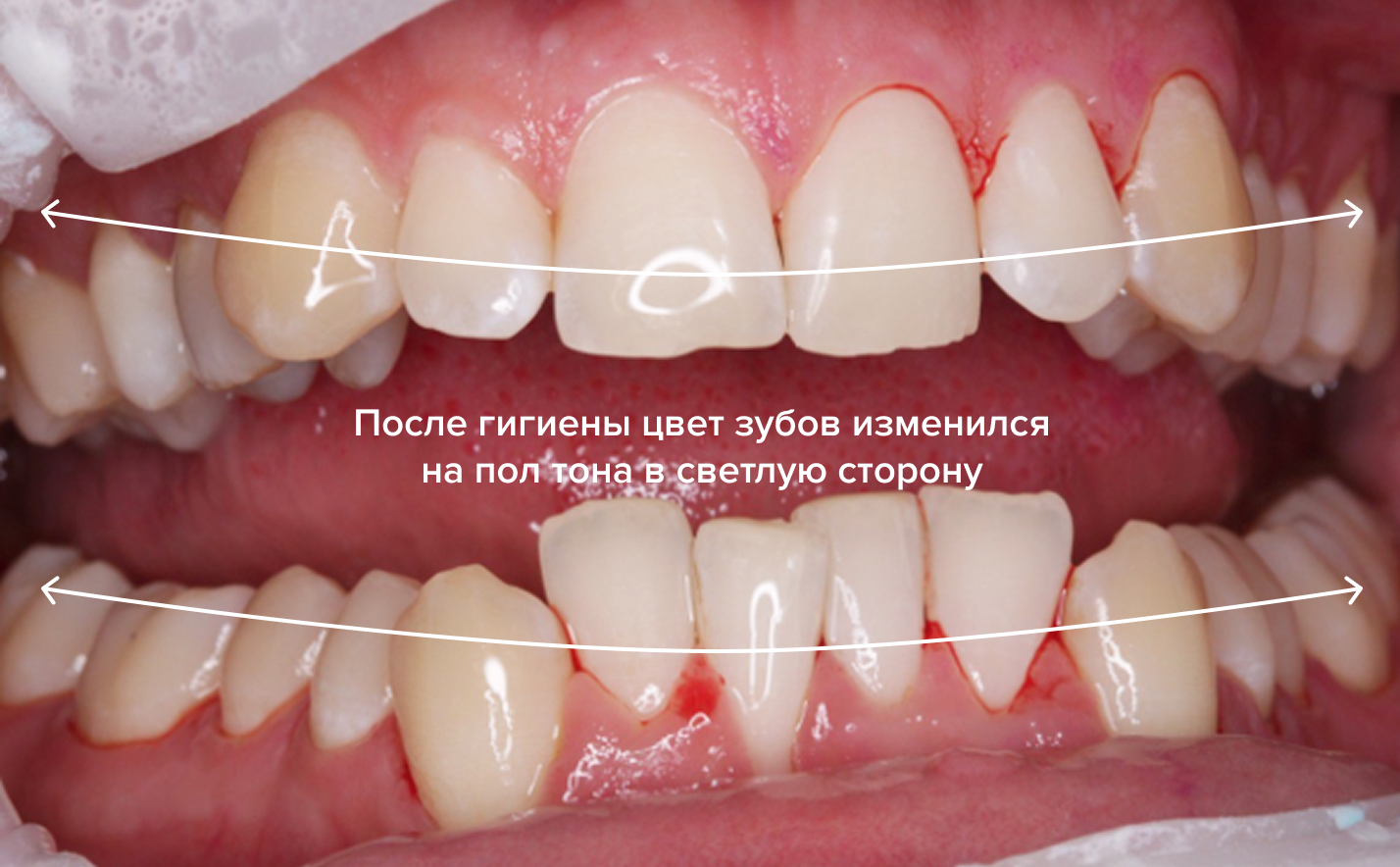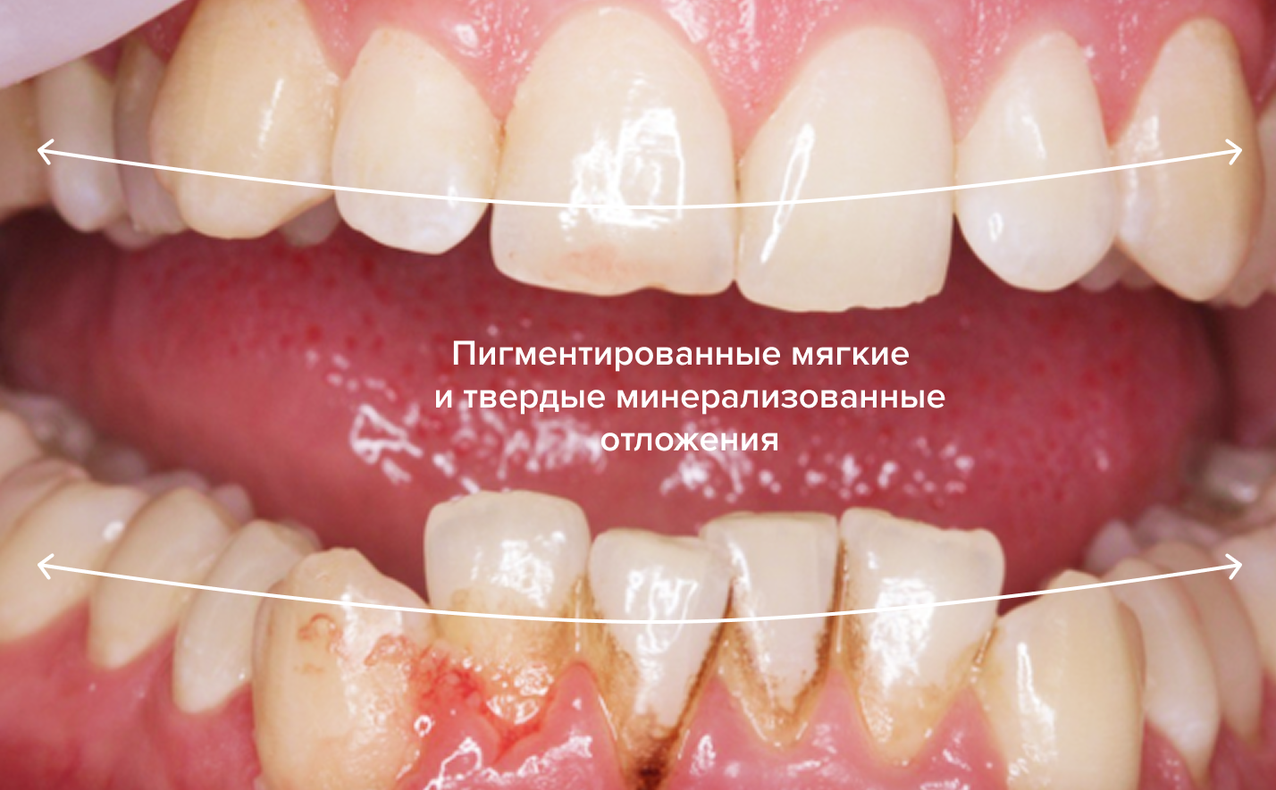 У пациента наблюдались массивные пигментированные мягкие зубные отложения и твердые минерализованные зубные отложения.